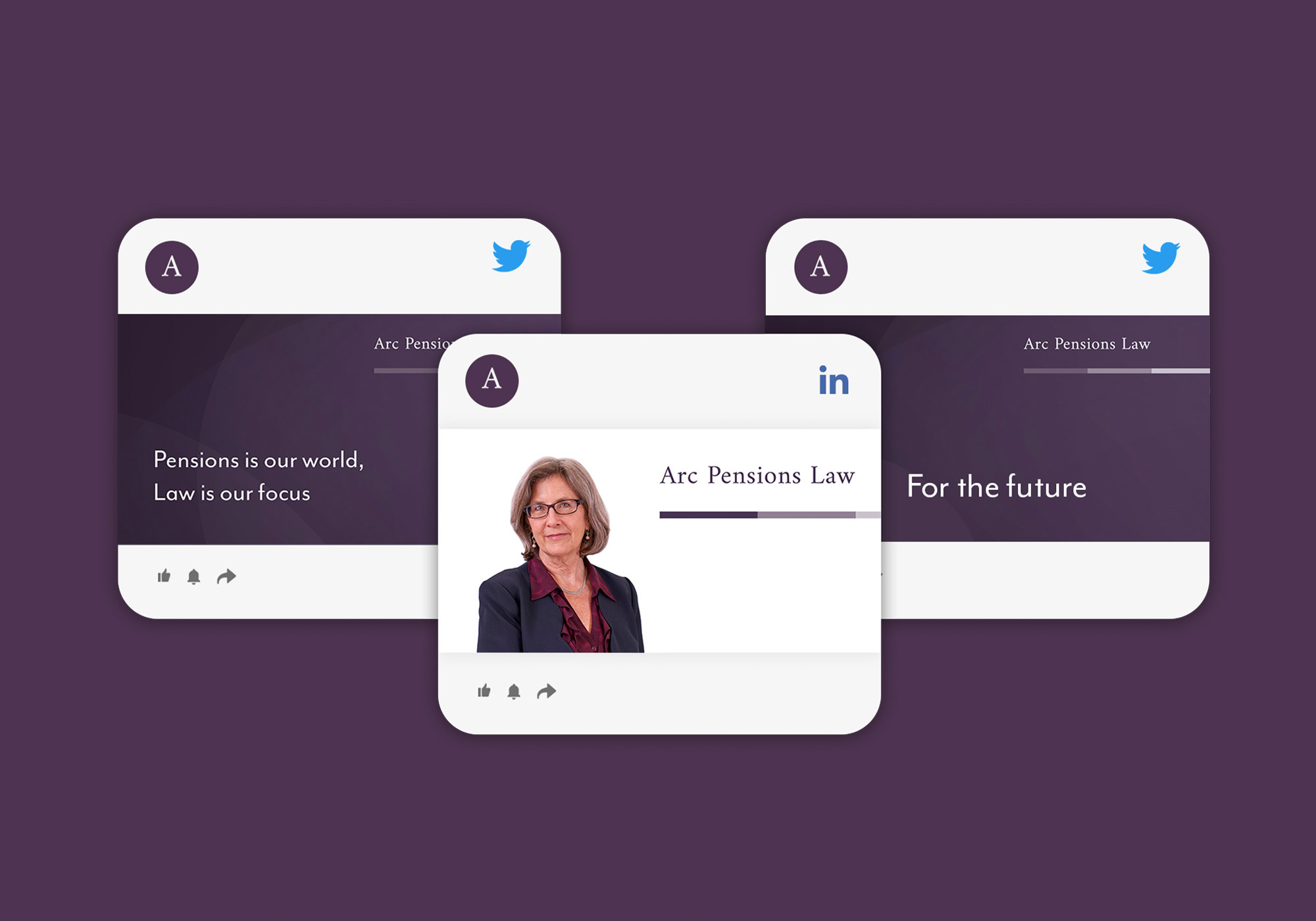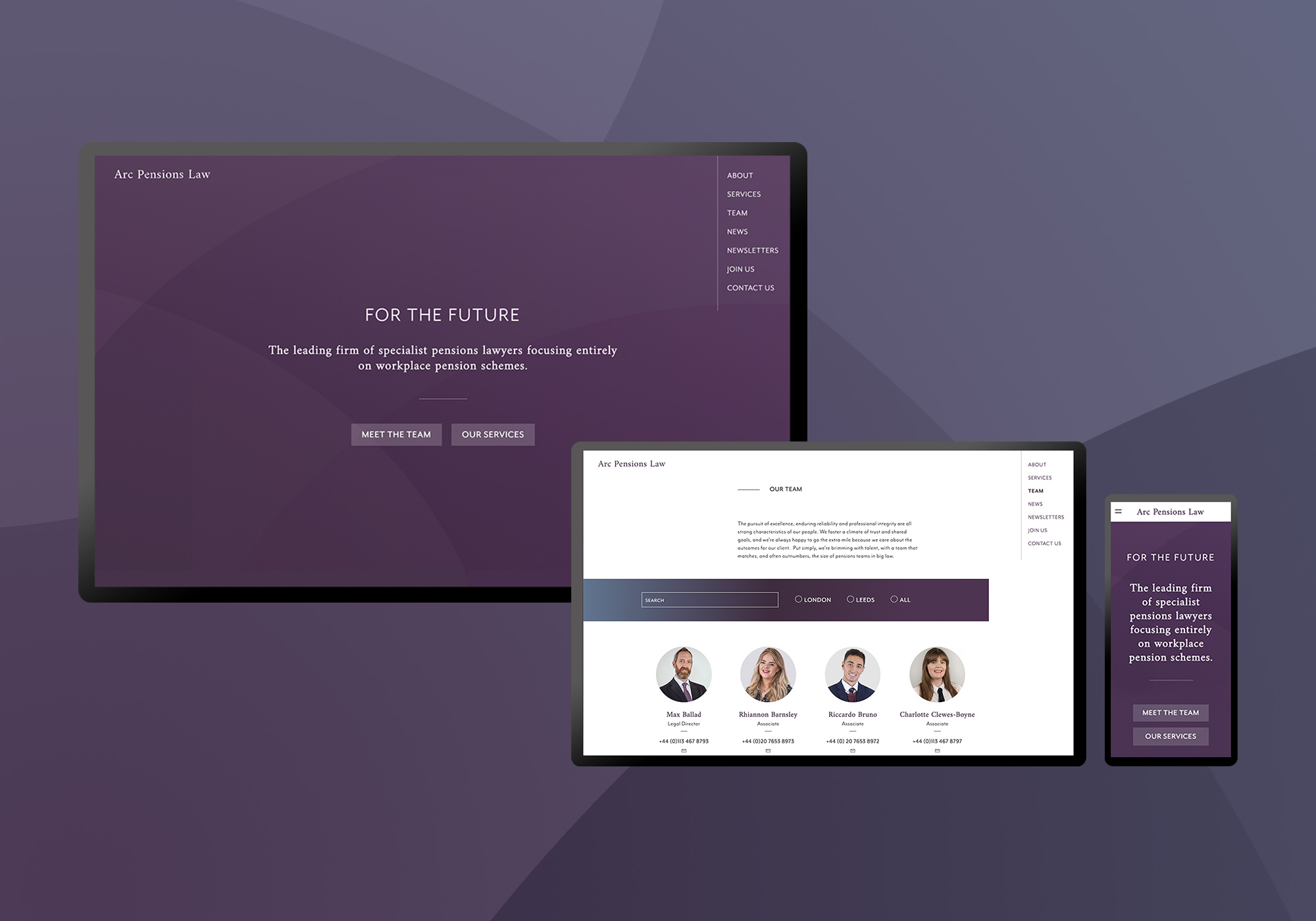 The established brand colour palette was updated to incorporate more elegant shades of purple with additional complementary accents. Subtle arc shapes were introduced for added depth and texture in order to reduce the use of generic law firm imagery. Deliverables included a set of new brand guidelines, website redesign, stationery and social media assets.