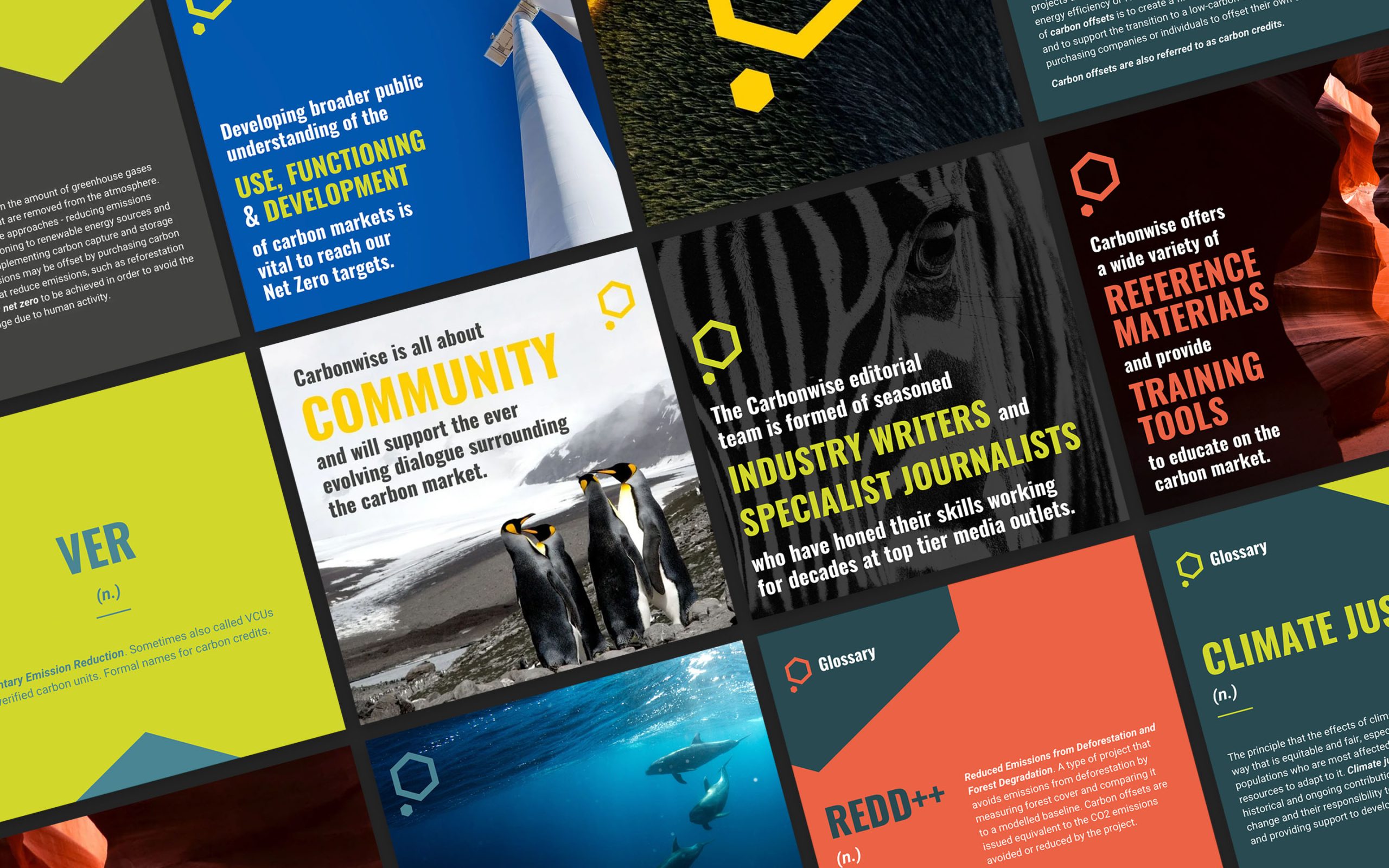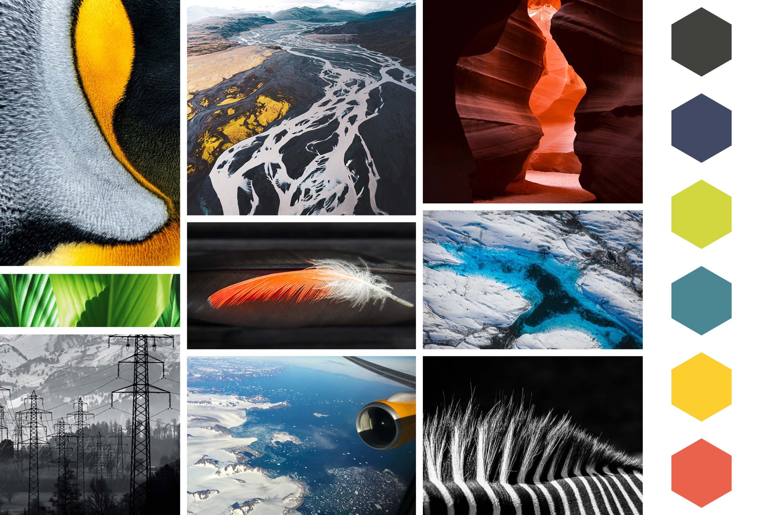 Industrial, smoky greys and purples were chosen to reflect carbon emissions and pollution. The main brand colour, a vibrant yellow-green shade, inspired by a young plant or new shoot, symbolises growth, light, energy and positive new beginnings. Accent colours were created from striking landscapes and wildlife.